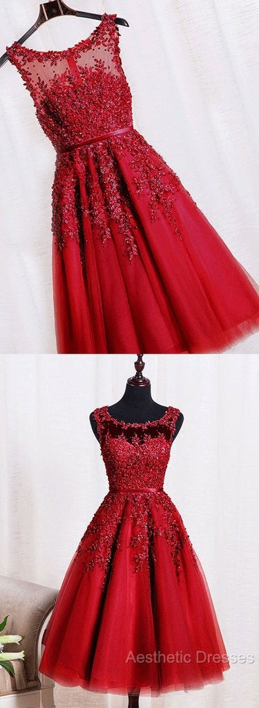 Red Tea Length Round Homecoming Dresses, Lace Applique Red Party Dresses, Vintage Style Evening Prom Dresses