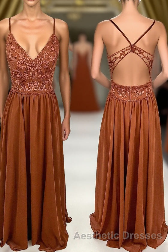 Rust Orange Lace and Chiffon A-line Long Bridesmaid Dresses