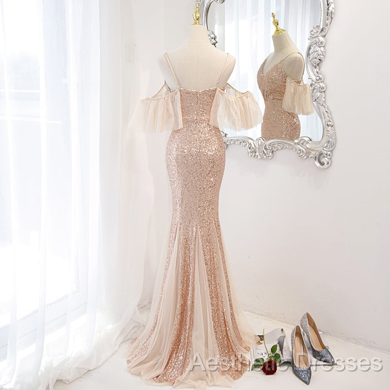 Sequins And Tulle Mermaid Long Party Dresses Evening Prom Dresses, Off Shoulder Formal Dresses