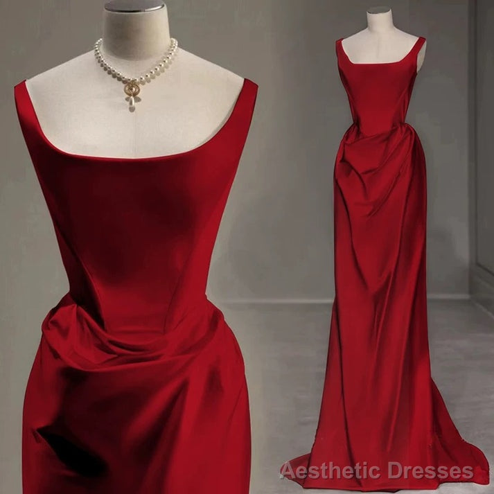 Sexy Mermaid Square Neckline Red Satin Floor Length Prom Dresses