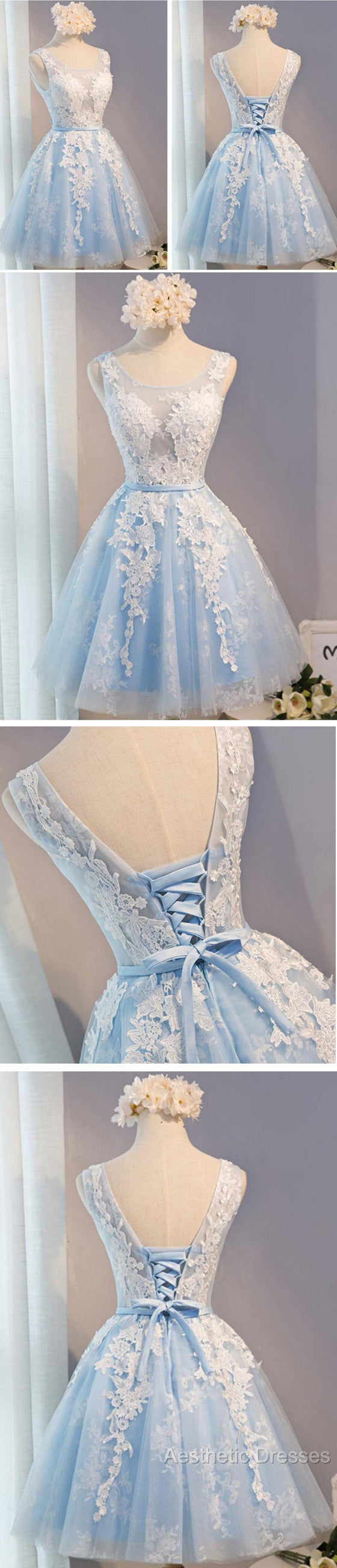 Short Blue Floral Prints Appliques Sleeveless Scoop Neckline Lace Up Back For Teen Lovely Homecoming Dresses