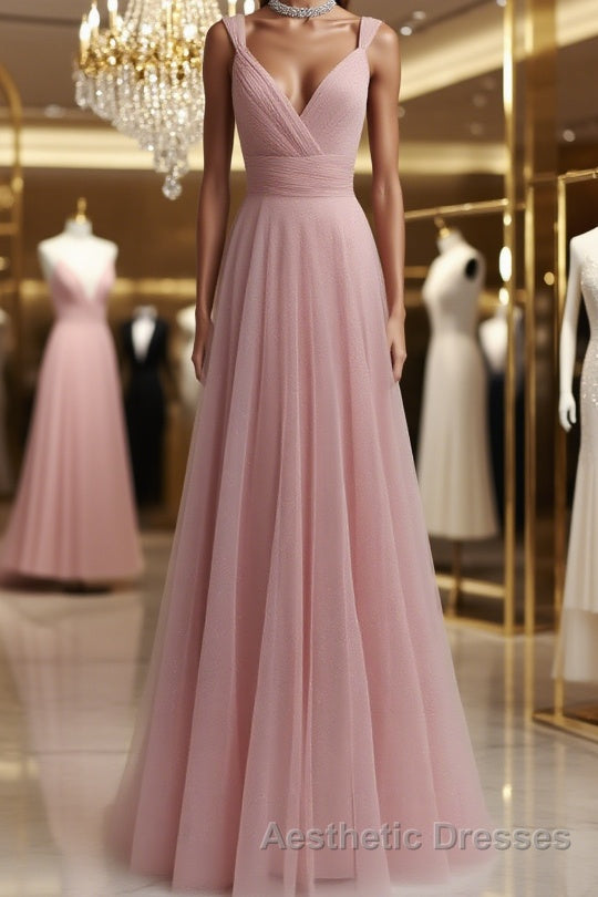 Simple pink tulle long Evening Prom Dresses pink tulle evening Dresses