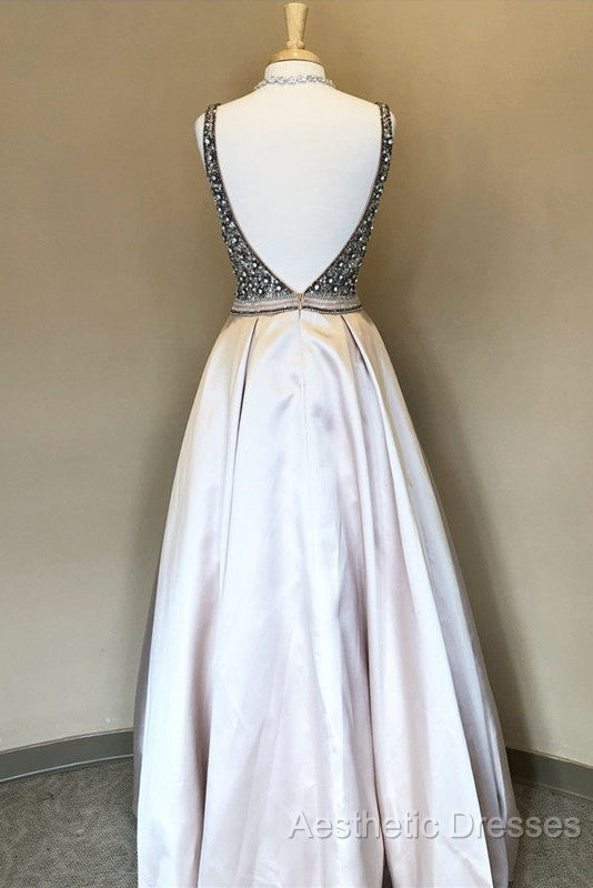 Sparkle Sequin Beaded V-Neck Long Satin Evening Prom Dresses