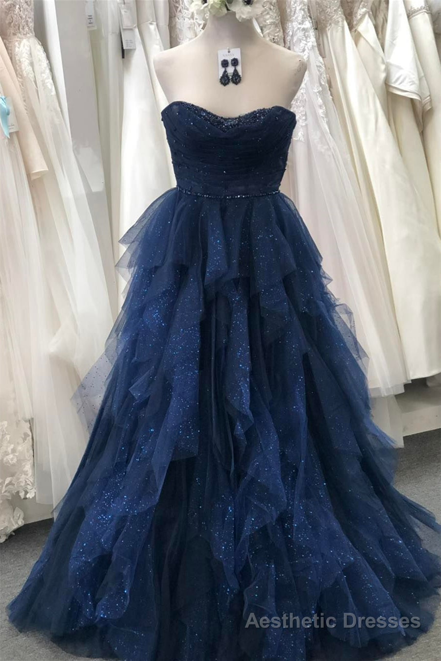 Sparkly Navy Blue Strapless Ruffle Layers Tulle Long Prom Dress