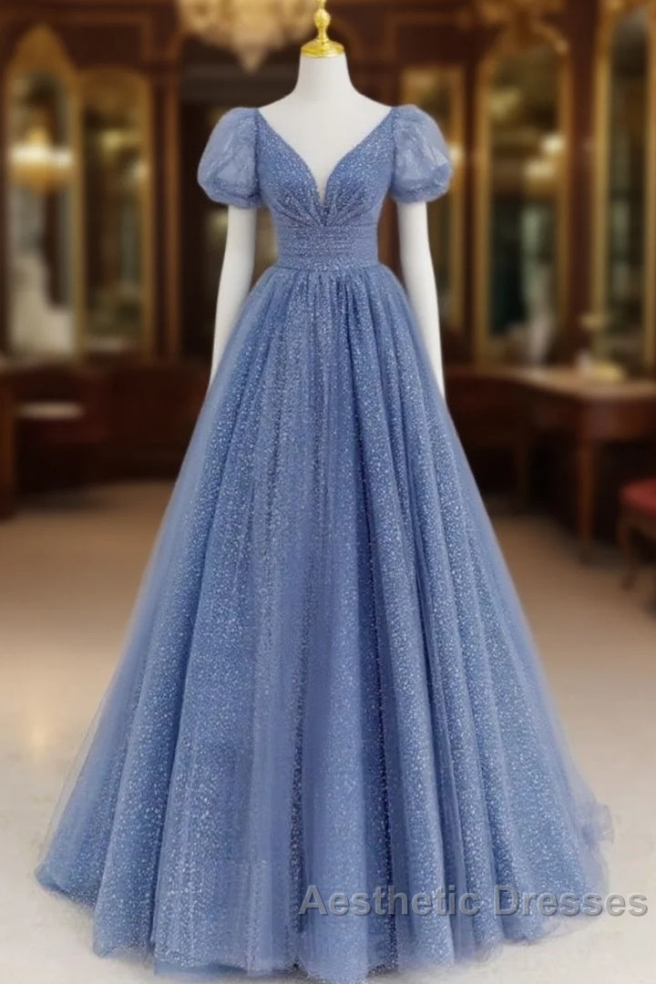 Tulle V Neck Short Sleeve Blue Sparkle Evening Prom Dresses With Bow