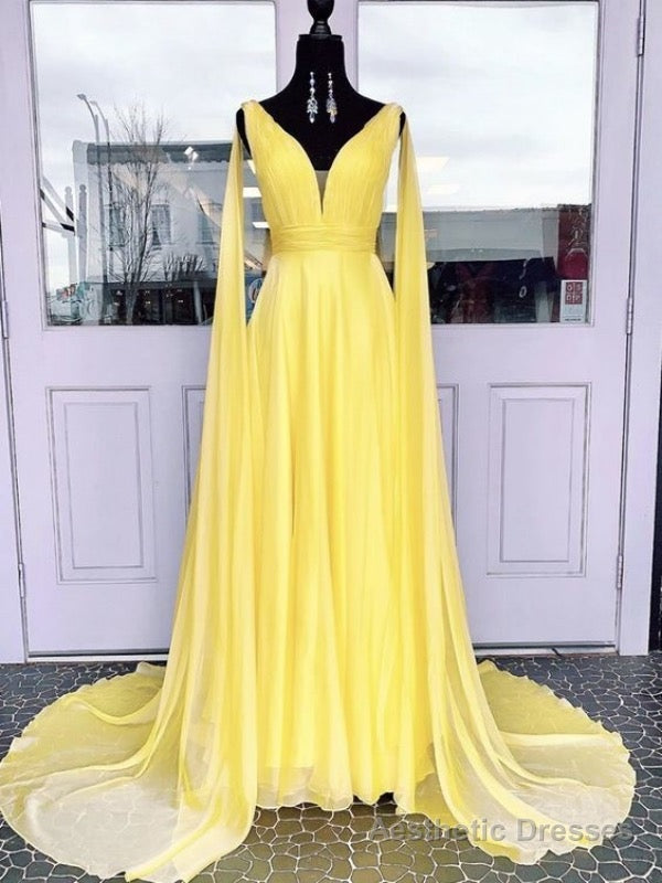 V-neck Chiffon Long Prom Dresses, A-line Prom Dresses