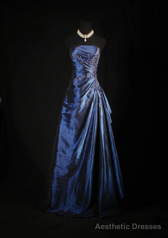 Vintage Ball Gown Strapless Navy Blue Satin Long Prom Dresses Party Dress