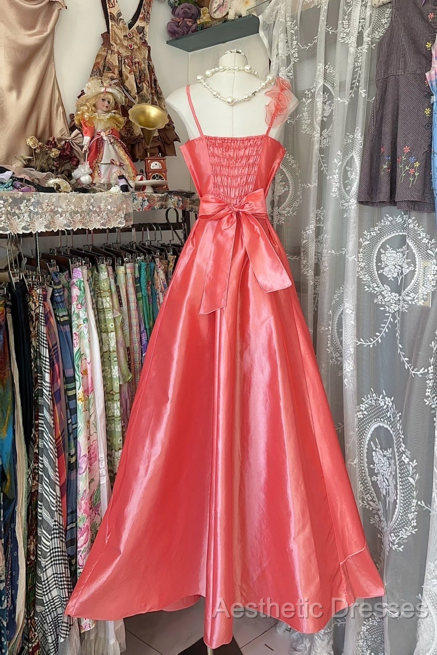 Vintage Fashion A Line Spaghetti Straps Pink Floor Length Evening Dresses Evening Prom Dresses