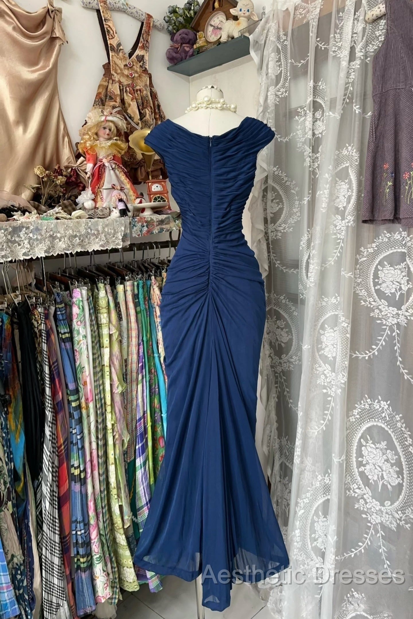 Vintage Fashion Mermaid V Neckline Navy Blue Floor Length Evening Dresses Evening Prom Dresses