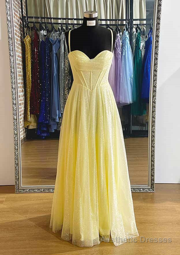 Yellow Prom Dresses, A-line Sweetheart Spaghetti Straps Long/Floor-Length Tulle Prom Dress With Pleated Glitter